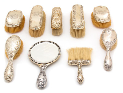 comprising 6 clothes brushes, two hair brushes and a hand mirror.