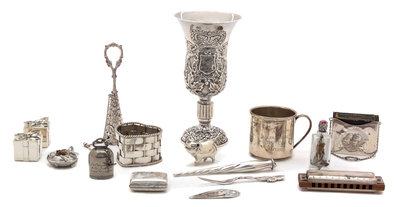 comprising; a Tiffany & Co. by Hohner harmonica, Tiffany & Co. salt and pepper shakers, a Cartier heart-form basket, a Kirk Stieff ornament, an S. Kirk & Son bookmark, an English miniature book rack, an Italian pig figurine, a goblet, a cup, a perfume bottle, a nosegay, and oyster fork and an 800 silver pillbox.