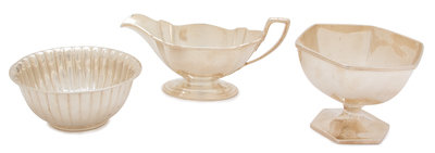 comprising a Gorham sauce boat and fluted bowl (dedicated on base), and a J.E. Caldwell footed hexagonal bowl (monogrammed)