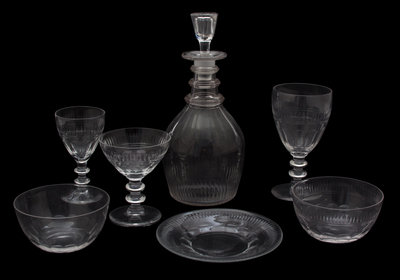 comprising; 10 bowls, 8 cordials, 6 water goblets, 5 champagne goblets, 5 small plates, a decanter; 35 items total.