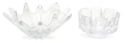 one Orrefors bowl in the Corona pattern, and one Daum leaf-form bowl, each signed.