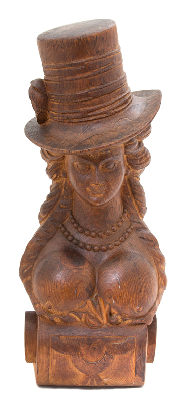 A Portuguese Carved Wood Bust of Woman in Top Hat