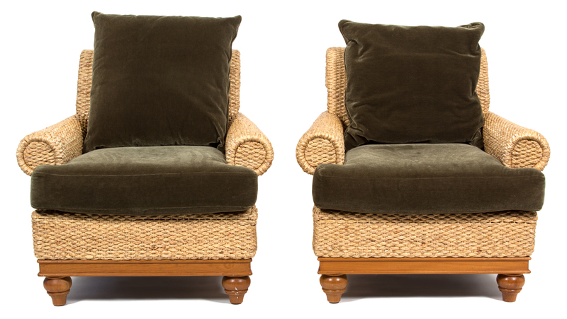 A Pair of Wicker Armchairs with Velvet Back and Seat Cushions