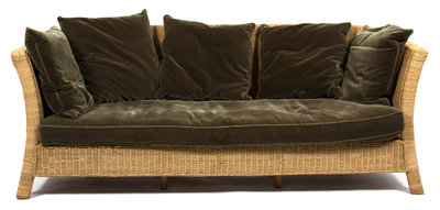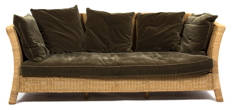 A Wicker Sofa with Velvet Seat and Back Cushions