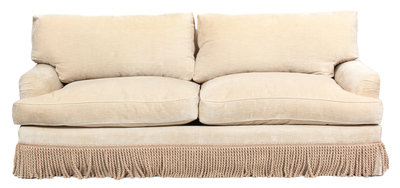 having two back and two seat cushions with a heavy fringed skirt.