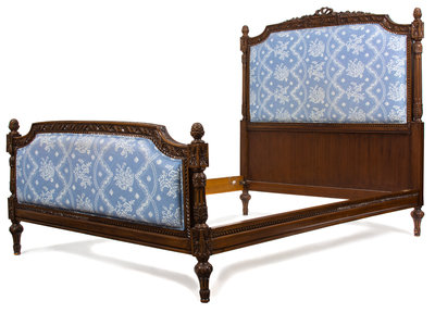 A Louis XVI Style Carved Mahogany Upholstered Headboard and Footboard