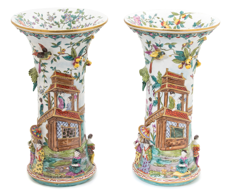 A Pair of Chinese Style Gu-Form High Relief Samson Porcelain Vases