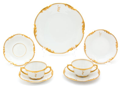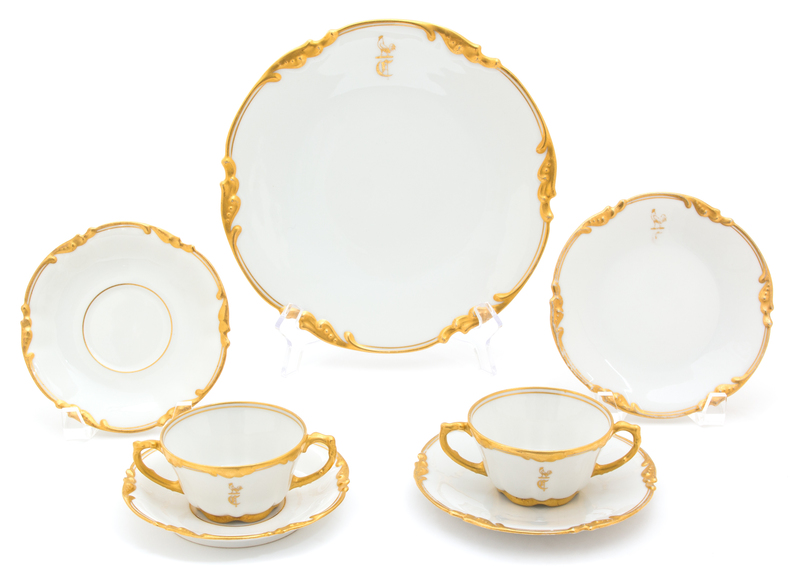 monogrammed, comprising; 11 dinner plates, 11 bread and butters, 11 bouillon cups and 12 saucers, 45 pieces total.