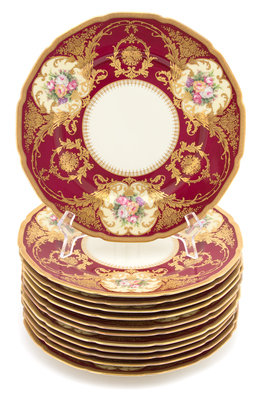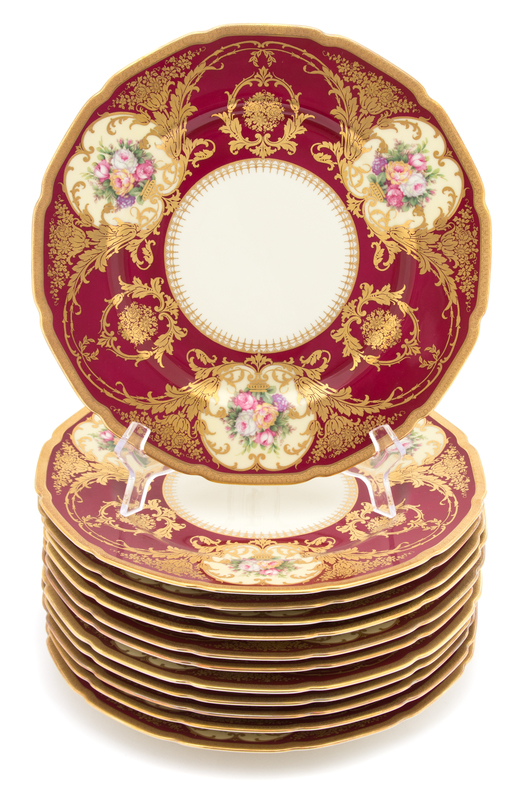 in the Ivory pattern, having floral vignettes with maroon and gilt details on ivory ground.