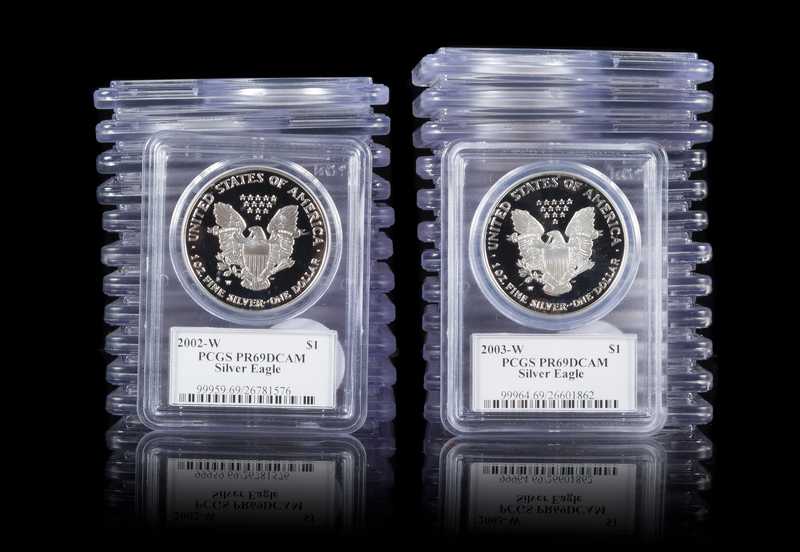 each graded PCGS PR69 DCAM, the tabs signed by chief engraver John M. Mercanti and comprising: 1987-S, 1988-S, 1989-S, 1990-S, 1991-S, 1992-S, 1993-P, 1994-P, 1995-P, 1996-P, 1997-P, 1998-P, 1999-P, 2000-P, 2001-W, 2002-W, 2003-W, 2004-W, 2005-W, 2006-W, 2007-W, 2008-W, 2010-W, 2011-W and 2012-W examples.
