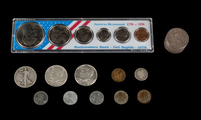 comprising an American Bicenetennial commemorative six-coin set, two Kennedy half-dollars, a 1919-S Walking Liberty Half-Dollar, a 1912 Barber dime, three 1943 steel pennies, a 1929 Lincoln penny and an 1889 and 1906 Indian Head penny, together with a hollowed stack of ten Indian silver rupees adapted to a box.