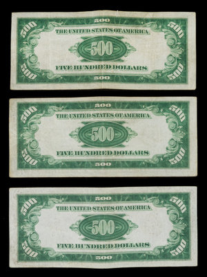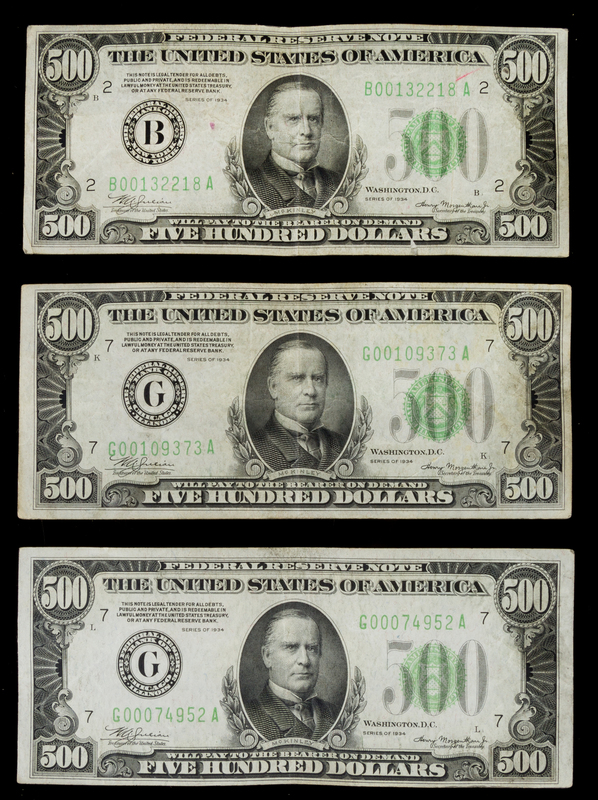 A Collection of Three United States 1934 $500 Federal Reserve Notes
