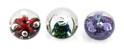 a group of three glass paperweightsone titled First Quarterone titled Moon Flower