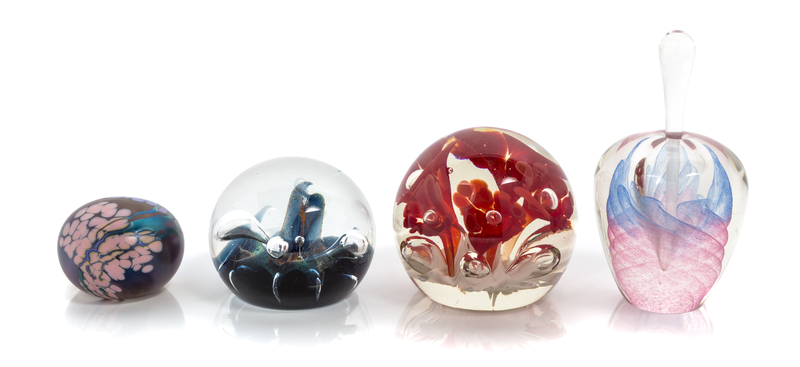two glass paperweights, together with an additional paperweight and a perfume bottle