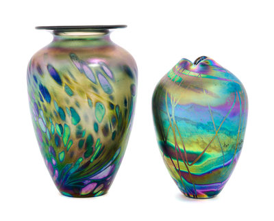 an iridescent glass vase, accompanied by another studio made glass vase, apparently unmarked