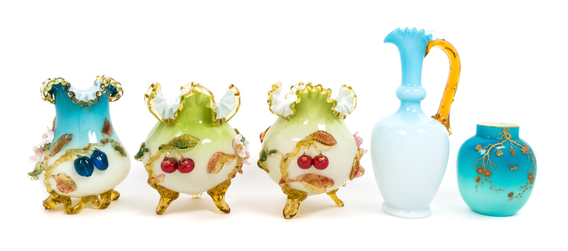 comprising a pair of Sandwich Glass vases with applied decoration and three peachblow examples