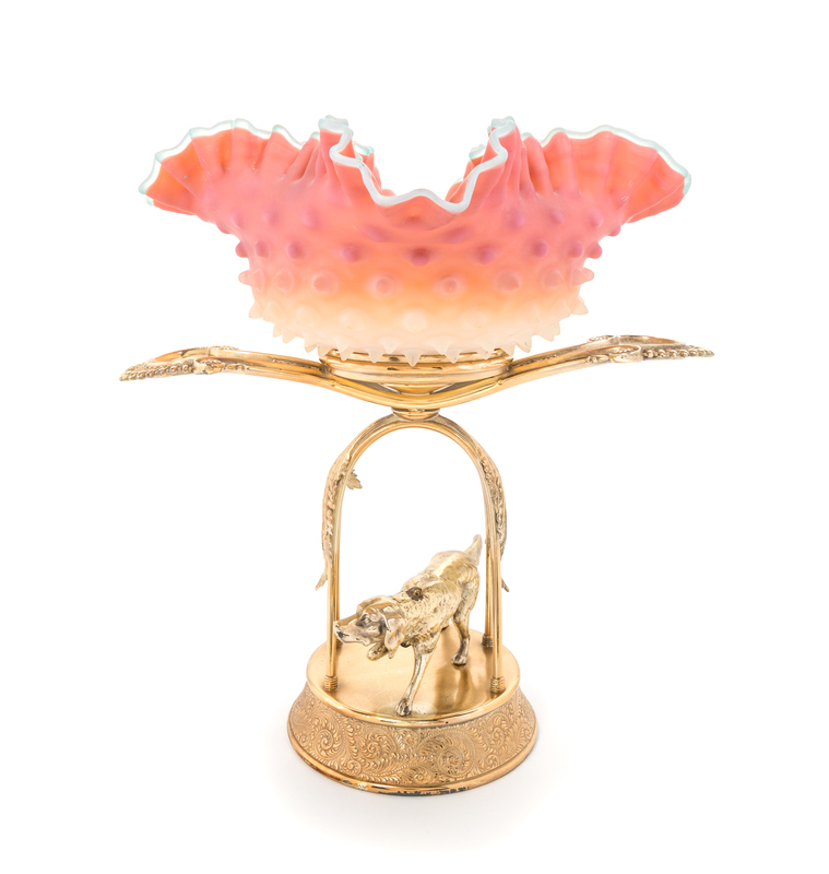 the crimped bowl set in a Rogers Smith & Co. aesthetic stand centered with a dog, the stand stamped and numbered 1621
