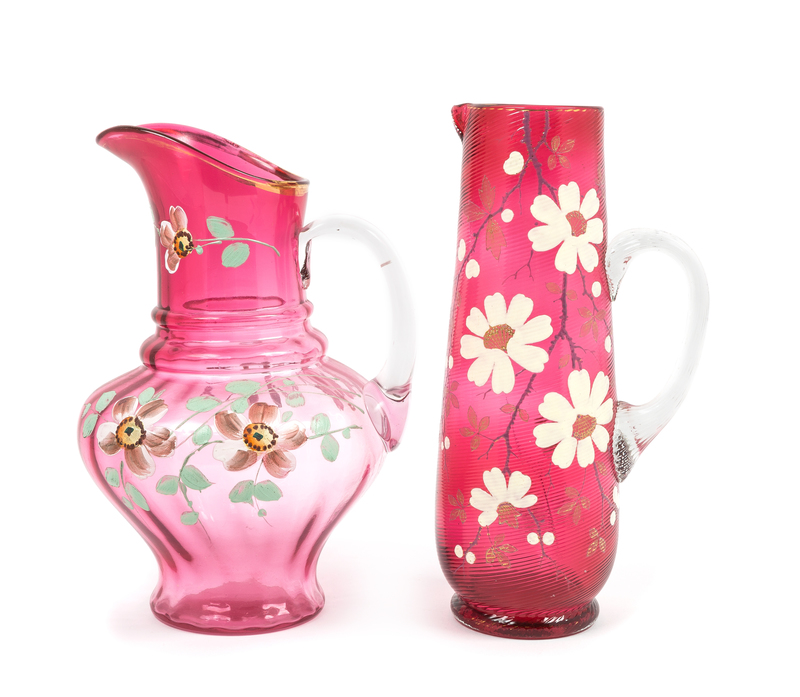 Two Painted Cranberry Glass Pitchers