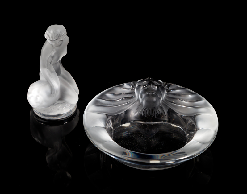 a group of two molded and frosted glass articles, comprising a Tete de Lion ash receiver and a Leda and the Swan figure