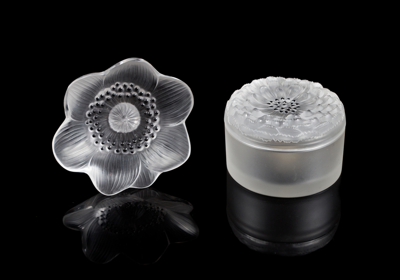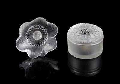 a pair of molded and frosted glass Anemone figural articles, comprising a paper weight and a box