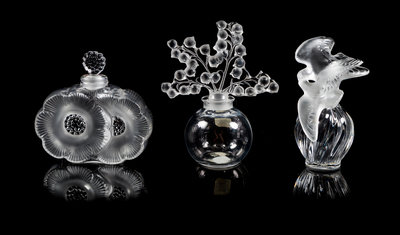 a group of three molded and frosted glass Clairefontaine, Deux Fleurs and L'Air du Temps Fatice perfume bottles