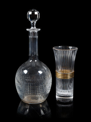 two cut glass table articles, comprising a decanter with a Christian Dior brass mounted vase