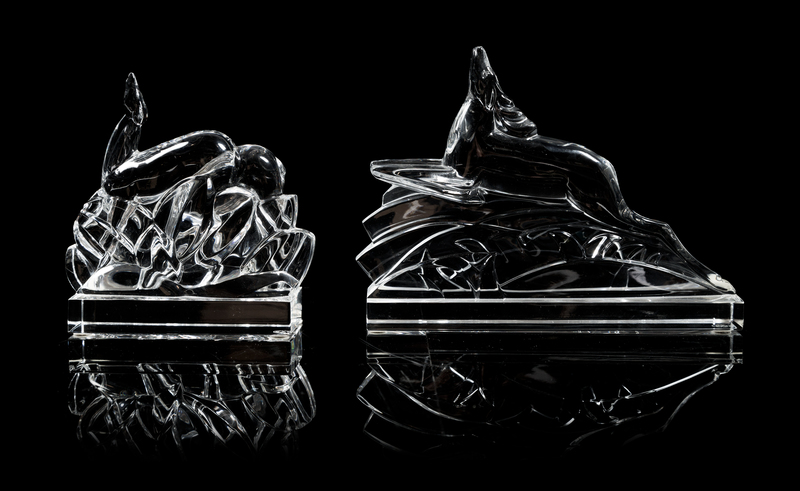 two Art Deco style glass figures, one depicting a leaping deer and the other grazing deer