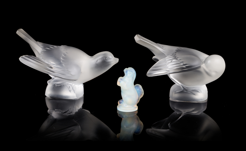 two molded and frosted glass figures, depicting birds, together with a Sabino glass dog
