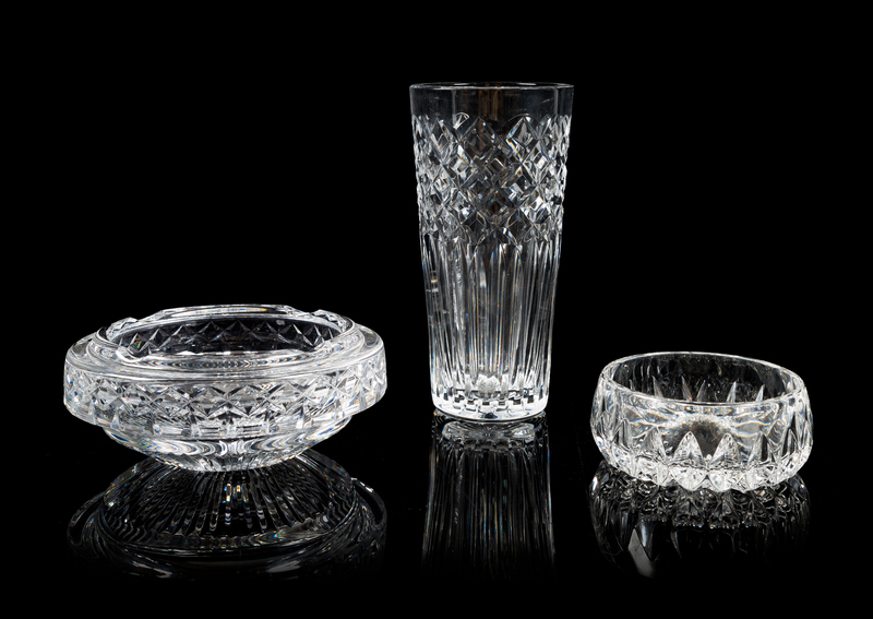 two cut glass table articles, comprising a vase and an ash receiver, together with an unmarked ash receiver