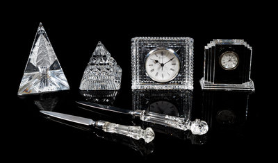 a group of six crystal table articles, comprising two clocks, two paperweights, and two letter openers