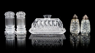 comprising two pairs of salt and pepper shakers, a covered sugar bowl with spoon, a butter dish, three small bowls, a candlestick, and two small plates