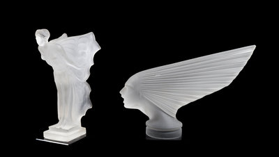 one depicting the Butterfly Girl designed by Heinrich Hoffmann, the other Victoire after Rene Lalique, each on a black glass base