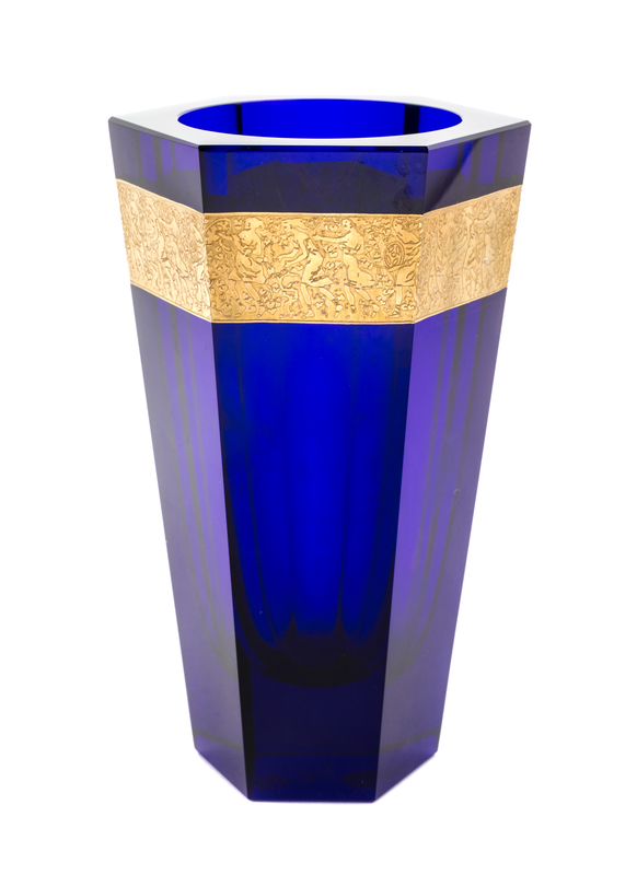 a cobalt blue vase, of tapering hexagonal form with gilt band decorated with classical figures