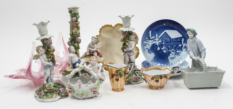 comprising a pair of Dresden porcelain figural candlesticks, a Dresden porcelain figural base, three B&G annual plates, two Venetian glass baskets, a Noritake creamer and sugar set and others; 13 total.