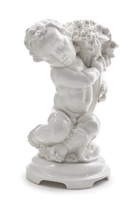 depicting a putto holding a bouquet of flowers.