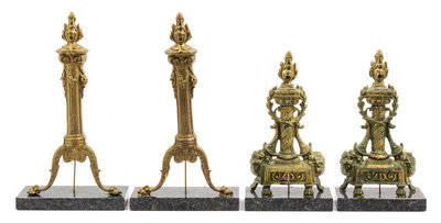 comprising a pair in the form of Ionic columns with flame finials, each raised on two splayed legs terminating in paw feet, together with a pair in the form of Ionic columns with flame finials and flanked by cornucopias, each raised on a shaped base terminating in paw feet and set on a rectangular marble plinth.