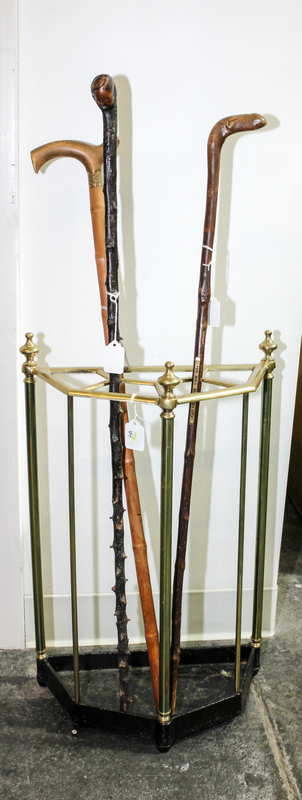 each with a wood handle in a brass stand.