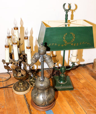 comprising a two light tole lamp, an Art Nouveau pewter lamp and a bronze lamp in the form of an urn issuing flowers.