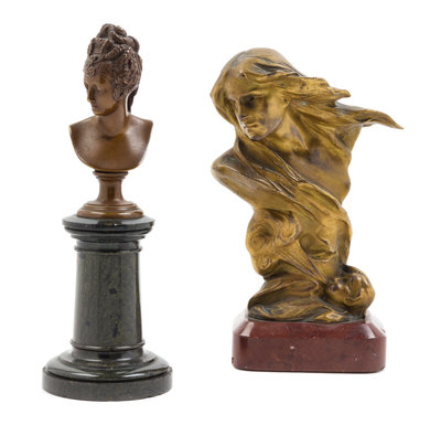 raised on a rectangular marble plinth with rounded corners, together with a patinated bronze bust of Diane de Poitiers, raised on a cylindrical columnar plinth.