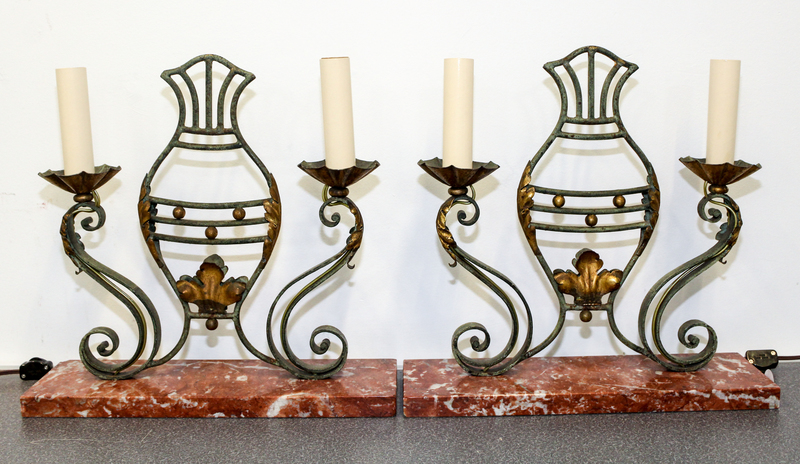 A Pair of Iron, Tole and Marble Two-Light Lamps