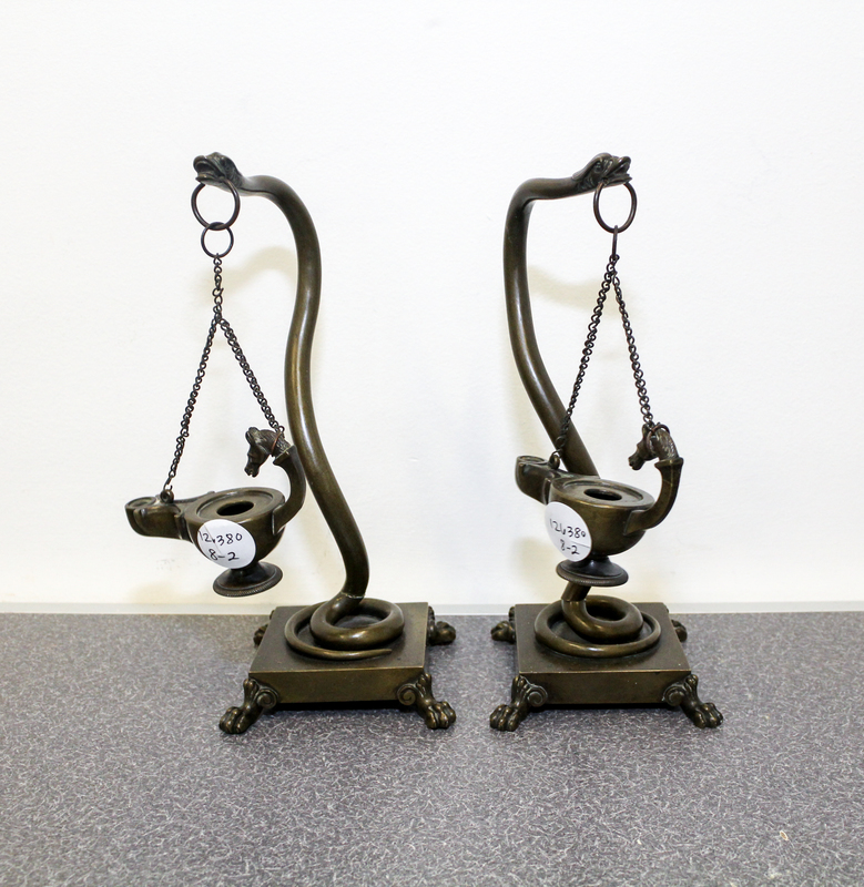 each in the form of a serpent suspending the horse decorated lamps from chains, raised on square bases set on four paw feet.