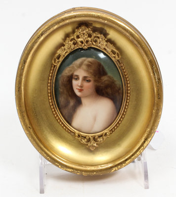 of oval form, depicting a maiden, set in a giltwood frame.