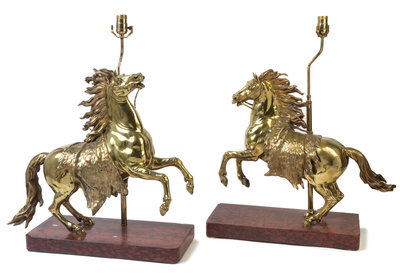 each in the form of a galloping horse, raised on a faux marble rectangular plinth with rounded corners and mounted as lamps.