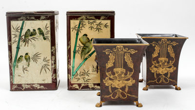 comprising a pair of canisters with Aesthetic bird and bamboo decoration and a pair of cache pots with lion mask ring handles and paw feet.