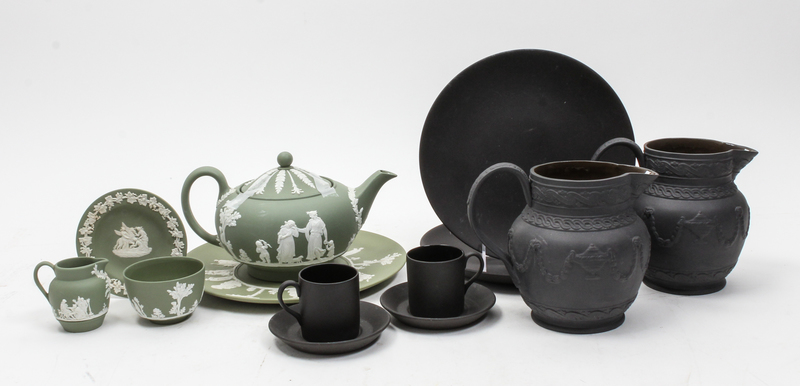 comprising two basalt plates, two basalt cups, two basalt saucers, a three piece jasperware tea set and an ashtray, together with two Italian basalt pitchers and an unmarked jasperware plate; 13 total.