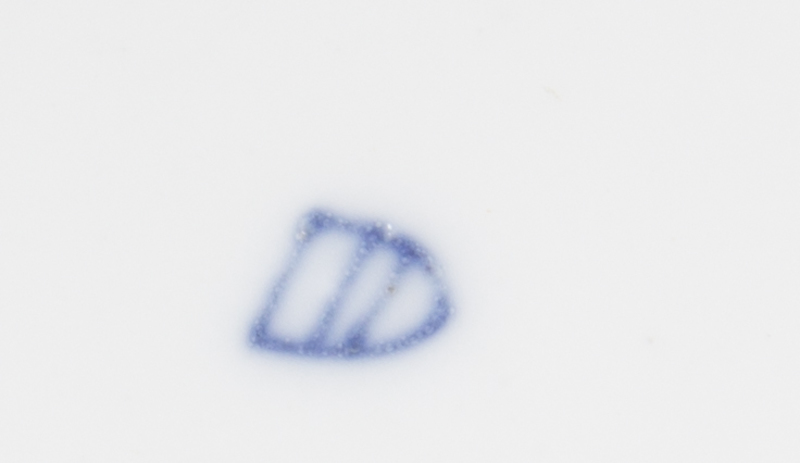 the central circular reserve painted to depict a draped maiden seated in a forest landscape holding an artist palette and painting a rainbow, within a polychrome paneled border with repeating gilt highlights, with a painted beehive mark in underglaze blue to the underside.