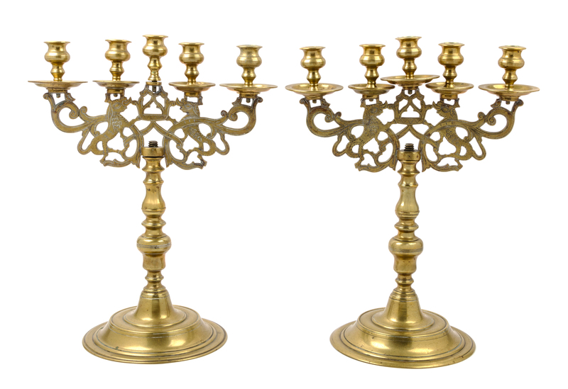 each having a knopped stem issuing the scrolling candle arms, raised on a domed circular foot.