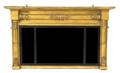 having a block front cornice over the three-part mirror set in a molded and leaf carved frame.