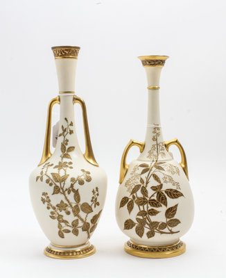 shapes 850 & 857, each of elongated bottle form with handles and gilt leafy branch decoration.