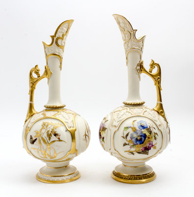 shape 1014, each of baluster, handled form, one with butterfly decoration the other floral.